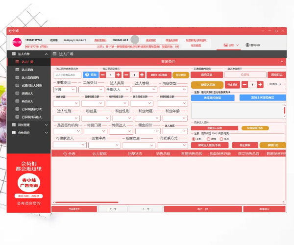 券小妹邀约工具助力抖音商家/团长,在建联达人/团长/商家过程中,可以批量邀约达人、批量私信达人、以及批量报名团长活动、批量报名达人招商活动,旨在提高建联的工作效率、以及降低成本的高效工具!